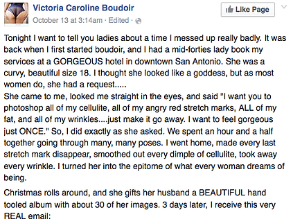 Victoria Caroline Haltom, uma fotógrafa de San Antonio, recorreu ao Facebook para confessar sobre todo o tempo que ela “havia se sentido muito mal”. Haltom compartilhou a história de uma mulher que se aproximou dela, para pedir que fizesse uma sessão de fotos na qual ela estaria usando lingerie sexy; essas fotos seriam um presente para o seu marido.